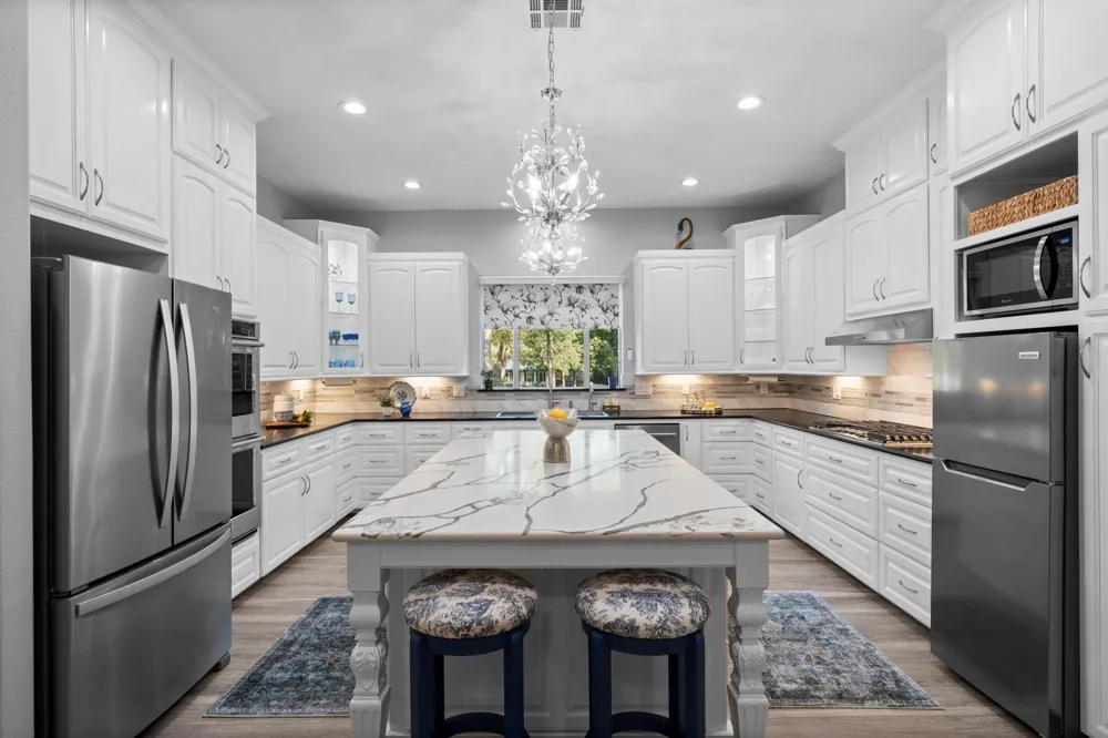 Gorgeous 3.19-acre estate in highly sought-after GATED Crown Oaks, just north of The Woodlands. This expansive property comprises a 5,496 sq ft main residence beautifully updated plus a 797 sq ft renovated garage apartment. Main house features 4 bedrooms and 4.5 baths, including TWO PRIMARY suites on the main level for convenient single-floor living. Completely renovated, chef-inspired kitchen with a large island, quartz countertops, white cabinetry, and new appliances with adjacent hearth room and breakfast room. Generous family room with a wall of windows flooding the space with natural light, complemented by new LVP flooring throughout much of the downstairs. Upstairs includes a large game room and media room, plus two spacious bedrooms with private baths. Renovated upstairs garage apartment: two bedrooms, full kitchen, living room, and bathroom. Fully fenced back yard with a large covered back porch, perfect for entertaining and relaxing in the serene 3.19-acre setting.